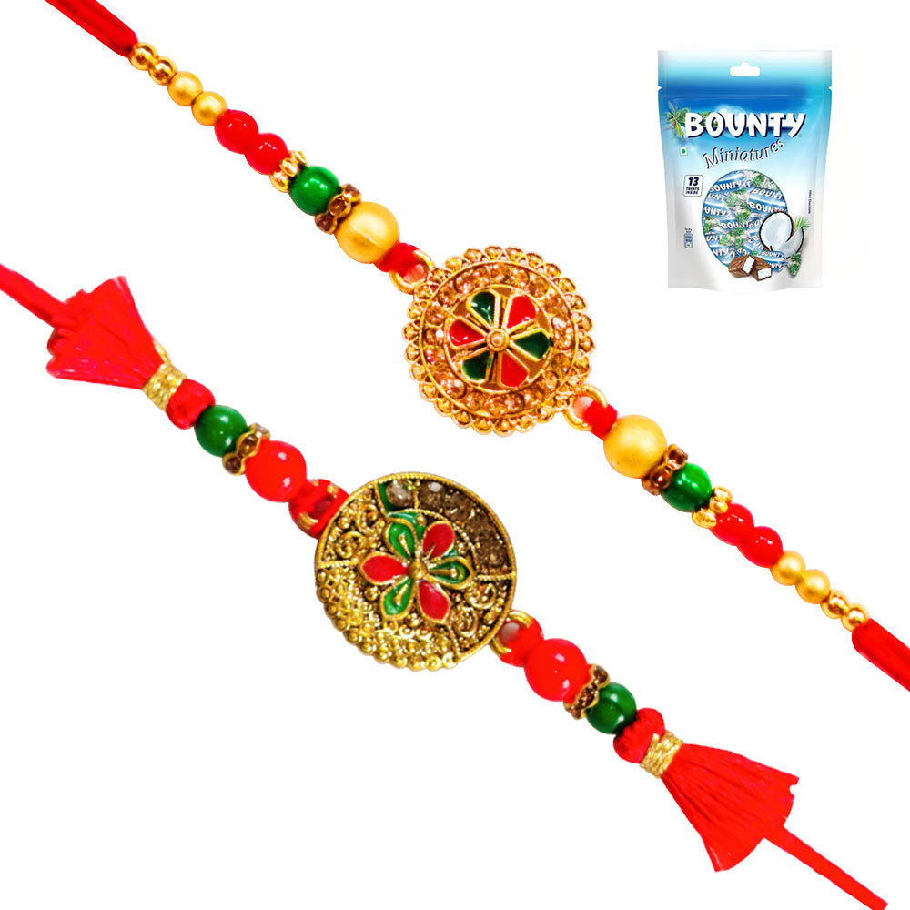 Set Contains : 1 Beads Rakhi. 1 User Selected Chocolate Pack. 1 Complimentary Rakhi Greeting Card. Options To Buy: 1 Rakhi & Cadbury Celebration 130g ,1 Rakhi & Cadbury Minis 17Pcs ,1 Rakhi & Snickers Minis 12Pcs ,1 Rakhi & Mars Minis 10Pcs ,1 Rakhi & Bounty Minis 13Pcs ,1 Rakhi & 2 Bournville Bars 80g each ,1 Rakhi &a...