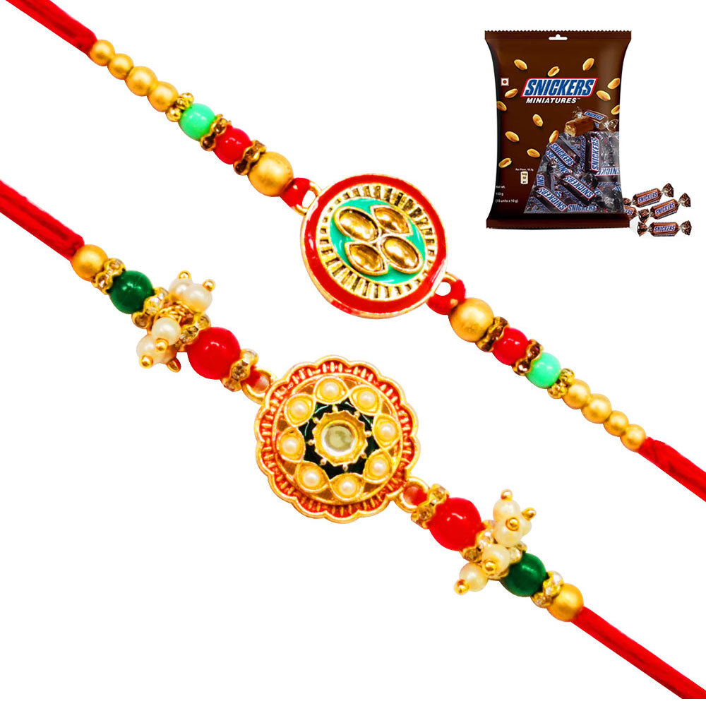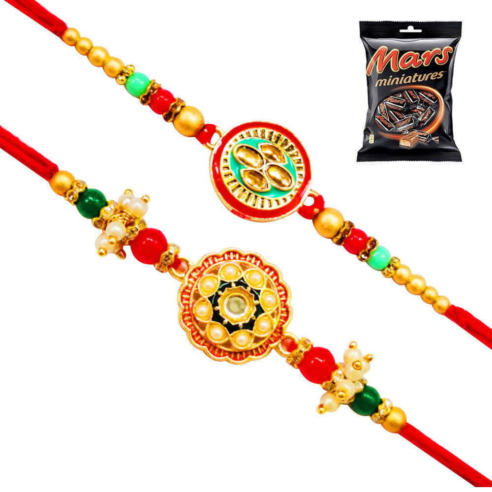 Set Contains : 2 Rakhi - Round Pendant Rakhi. 1 User Selected Chocolate Pack. 1 Complimentary Rakhi Greeting Card. Options To Buy: 2 Rakhi & Cadbury Celebration 130g ,2 Rakhi & Cadbury Minis 17Pcs ,2 Rakhi & Snickers Minis 12Pcs ,2 Rakhi & Mars Minis 10Pcs ,2 Rakhi & Bounty Minis 13Pcs ,2 Rakhi & 2 Bournville Bars 80g...